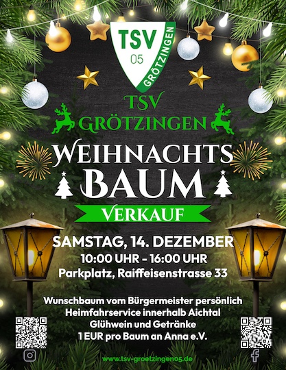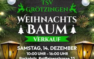 TSV Grötzingen Weihnachtsbaumverkauf Samstag, 14. Dezember, 10 Uhr - 16 Uhr Parkplatz Sportplatz, Raiffeisenstrasse 33, 72631 Aichtal Heimfahrservice innerhalb Aichtal Glühwein und Getränke 1 EUR an Anna e.V. pro verkauften [...]